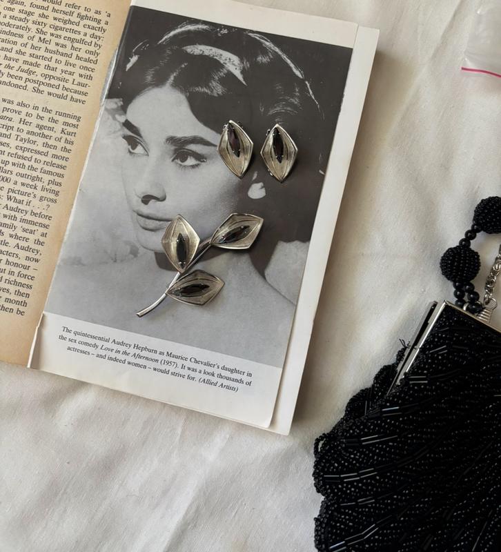 Прикраси виконані у сріблястому кольорі-1200📮 • Брошка: Витончена брошка-гілочка з двома стилізованими листками. Листки мають загострену, витягнуту форму, схожу на «маркіз» або «човник», і, ймовірно, містять інкрустацію з темного прозорого каменя чи скла, що додає глибини. • Парні кліпси виконані у тому ж стилі, що й листки брошки.Вони мають ту ж загострену форму з темною вставкою❣️