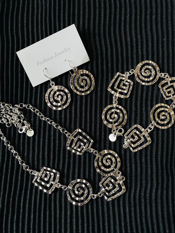 Стильний набір 925 стерлінг соібло. Комплект; кольє,браслет та сережки Один в наявності! набір ювелірних виробів, що складається з намиста, браслета та сережок з візерунком у вигляді спіралей та квадратів, виготовлених зі стерлінгового срібла 925 проби На кожному виробі пломба