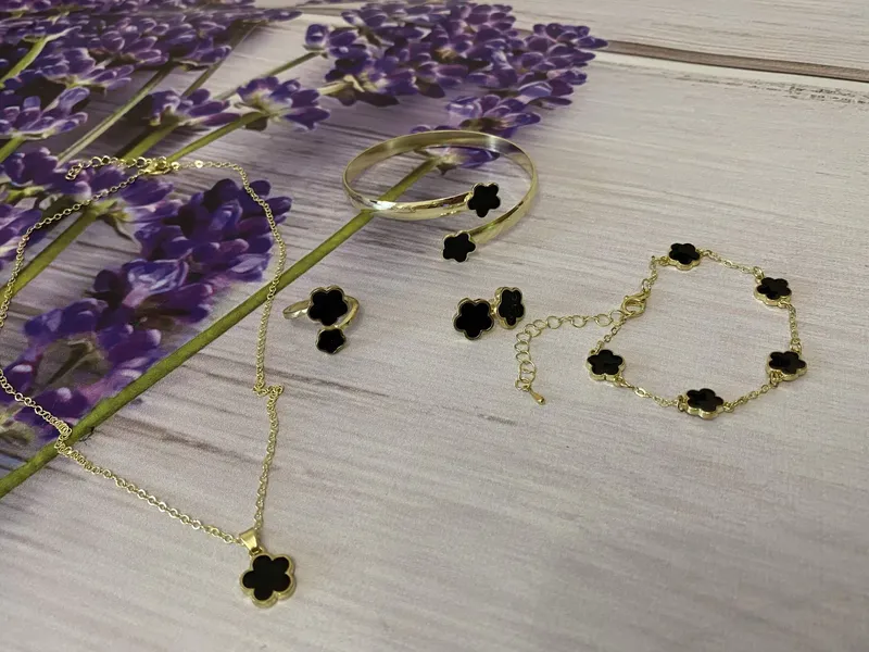 2 браслета, кольцо, серьги, цепочка с подвеской. Ювелирная эмаль, качественное покрытие под золото. Браслет-цепочка 23 см. плотный браслет- разъемный. изначально Д7, кольцо- разъемное, изначально размер 17, цепочка 44 см. +5 см. серьги- гвоздики.