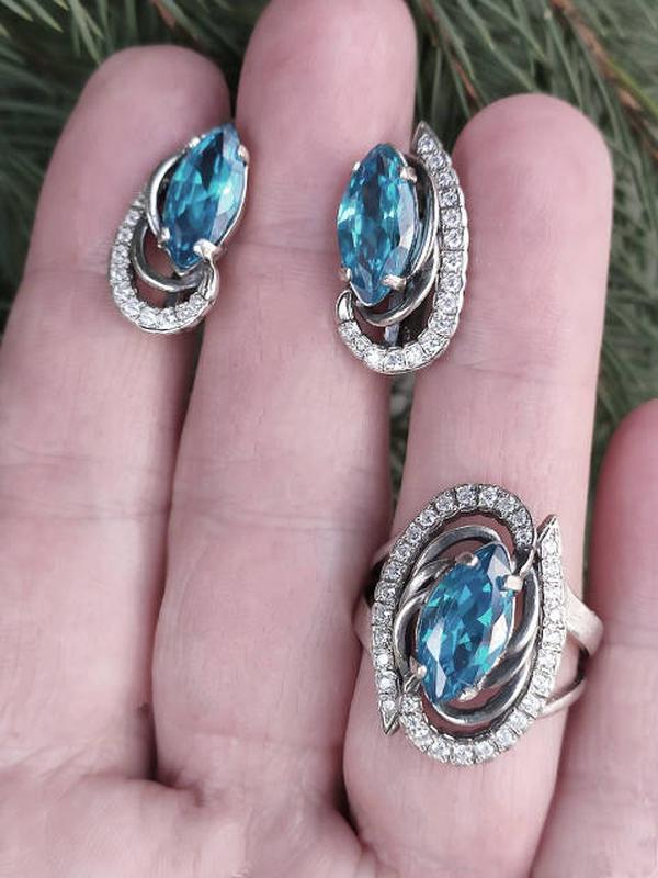 Серебряный набор 925 пробы Вставка куб цирконий Вага каблучки 7,03 гр Вес серег 8,4 гр Размер 19,5