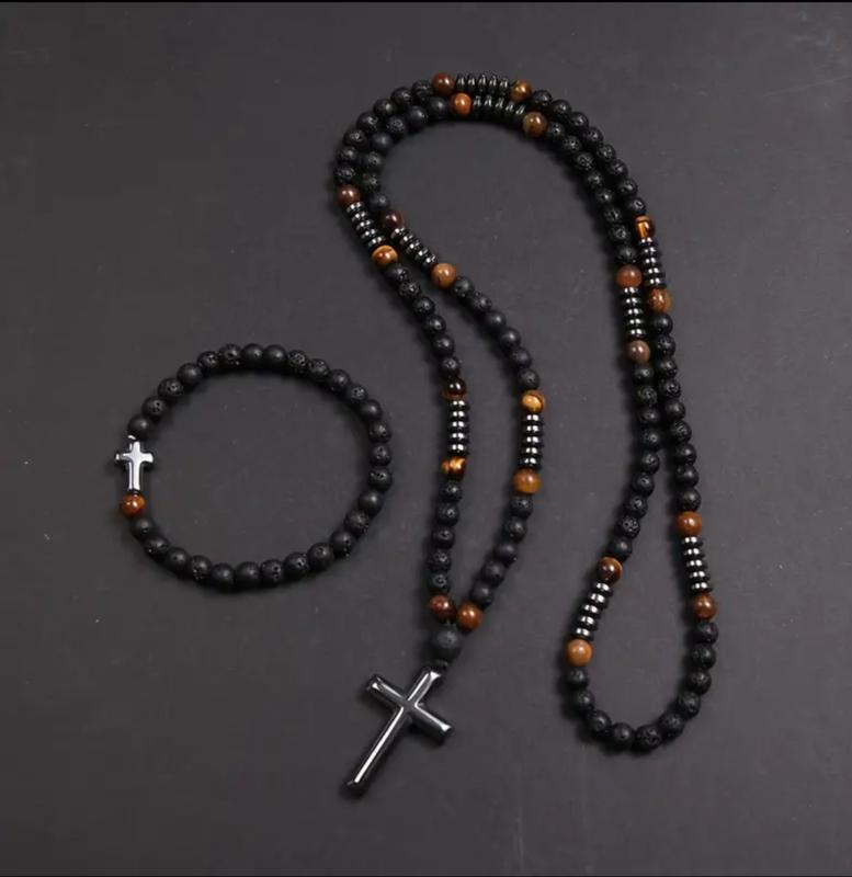 ✝︎🖤 Набор: стильный колье-розарий с крестиком и браслет. Набор из гематита и натурального камня: тигровый глаз и вулканическая скамья. Фурнитура - черный гематит. Длина не регулируется. !!! Внимание, в продаже есть подобные колье из других натуральных камней. Размер: длина 70 см, размер бусин 6 мм, размер крестика 3,5 х 2,5 см. Состав: натуральный камень тигровый глаз, гематит, вулканическая скамья.
