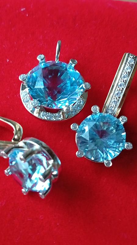 Шикарный золотой набор серьги 9 гр., кольцо 9 гр. кулон 5 гр., белое и желтое золото, 585пр., натуральные топазы бриллиантовой огранки, вставки циркония, набор новый, выполненный киевским ювелиром общий вес 23 гр.