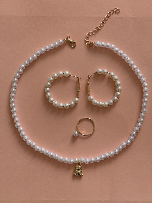 Красивый набор украшений с жемчужинами Ожерелье: длина-40см+7см, Подвеска:высота-1,3см,ширина-1см Серьги: Кольца,диаметр-4см Кольцо:Диаметр-17см, не замкнутое (на больший размер регулируется. Жемчужинка:диаметр-0,5см