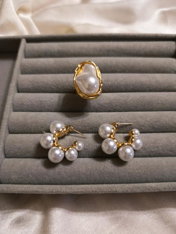материал -сплав. в сережках, застежка -гвоздик, из стерлингового серебра, гипоаллергенная отделка искусственными жемчужинами ✨ кольцо безразмерное. регулируется под нужный размер пальца. нарядный и нежный комплект украшений для дополнения вашего образа 😍