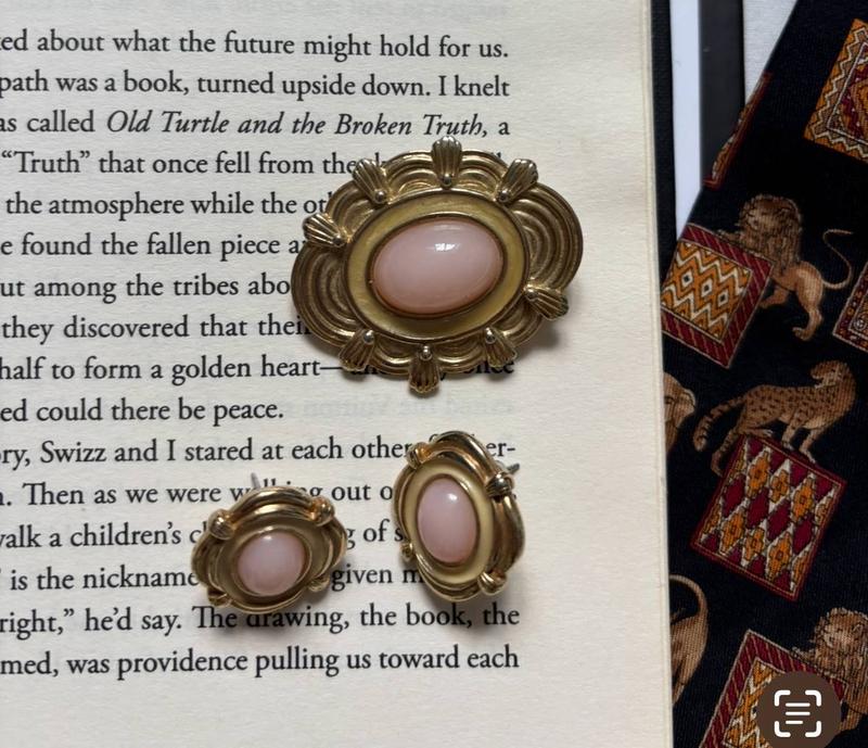Це гарнітур із трьох предметів, який включає сережки та брошку, виконані в єдиному вінтажному стилі з золотистого металу та рожевих вставок❣️-850📮