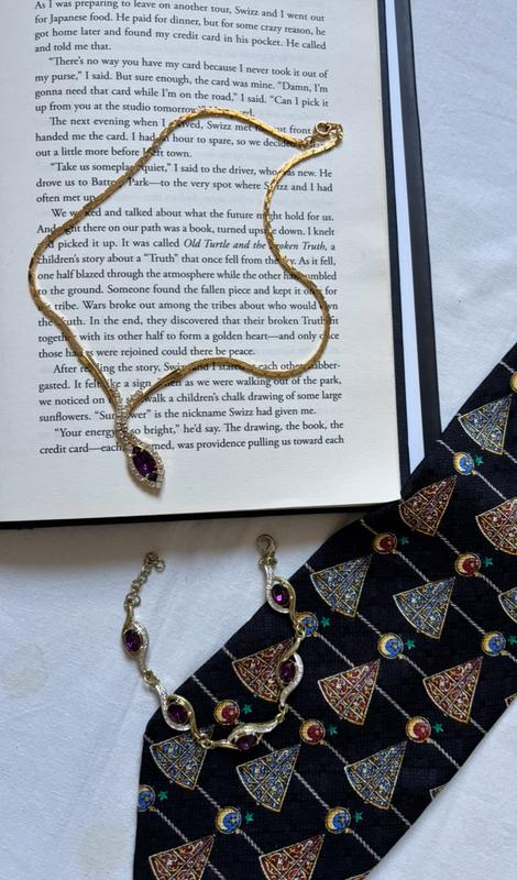 Сет включає два вишукані ювелірні вироби-1500❣️ • Намисто (Ланцюжок з кулоном): Тонкий золотистий ланцюжок із підвіскою-кулоном. Кулон має форму краплі або овала, інкрустований яскраво-фіолетовим (аметистовим) каменем у центрі, оточеним дрібнішими прозорими або білими каменями (стразами), які підкреслюють його блиск. Намисто елегантно лежить на сторінці книги. • Браслет: Золотистий браслет, що складається з кількох сегментів. Кожен сегмент прикрашений схожими фіолетовими каменями овальної або круглої форми, також оточеними дрібнішими прозорими каменями. Браслет розташований на краватці, частково перекриваючи її❣️