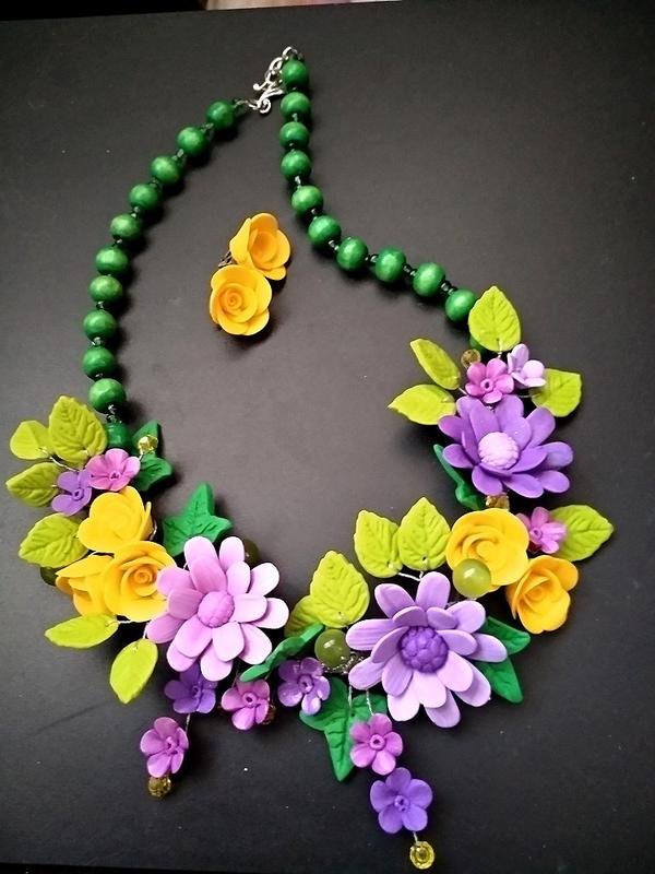 Колье и серьги с желто сиреневыми цветами из полимерной глины для женщин