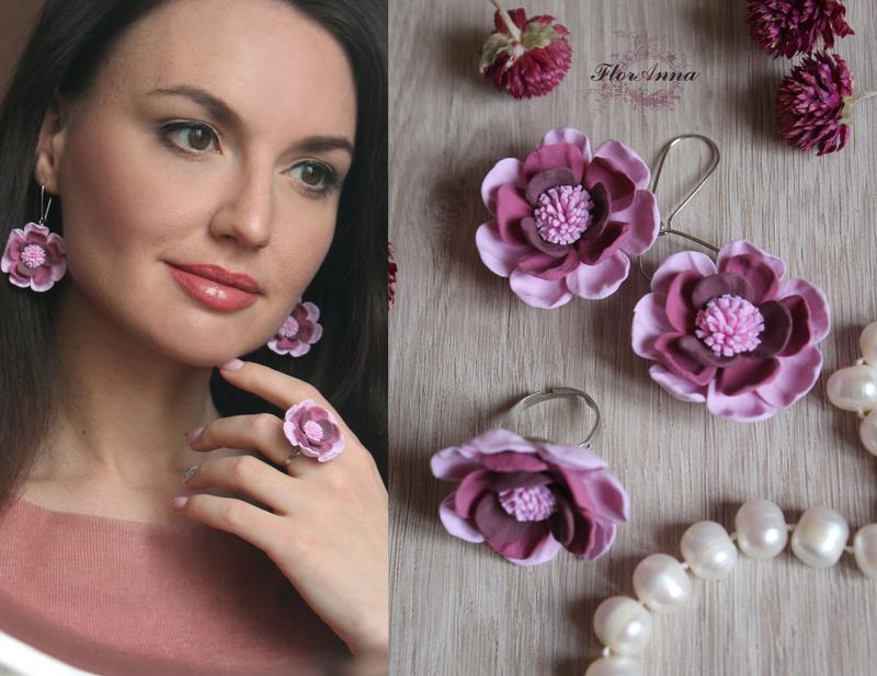 Шикарный и воздушный комплект украшений "Нежный пурпур" для волшебного образа. Каждый цветочек слеплен вручную из самоотвердевающей полимерной глины decoclay.цветы очень легкие, практически невесомые. Комплект украшений из полимерной глины оригинальный подарок девушке. Все девушки обожают цветы. Наши цветы дополнят образ и никогда не завянут. Диаметр цветочков 3,5 см Размер кольца регулируется Рекомендации по уходу за изделиями 1) Противопоказание воздействие с водой. Так как глина самоотвердевающая и высыхает в течении суток, не рекомендуется изделия мочить. Если на изделие попала вода, положите изделие под лампу или дайте ему хорошо высохнуть 2).Бережное обращение. Наши цветочки слеплены вручную и лепестки расскатываются достаточно тонкие, чтобы цветочки были максимально схожи с живыми. Поэтому, на цветы не рекомендуется сильно надавливать, чтобы избежать механического повреждения.Одевая украшения, необходимо надавливать на фурнитуру или на центр композиции(не на крайние лепестки) При падении с изделием ничего не случится. 3) Если изделие случайно испачкалось, можно протереть его влажной кисточкой(не мокрой) 4.) Под верхней одежной и головными уборами изделия не носить. Если соблюдать все эти правила, изделия вас будут радовать очень долго. FlorAnna Мы всегда с Вами на связиViber,WhatsApp +38 ************* (Юля)