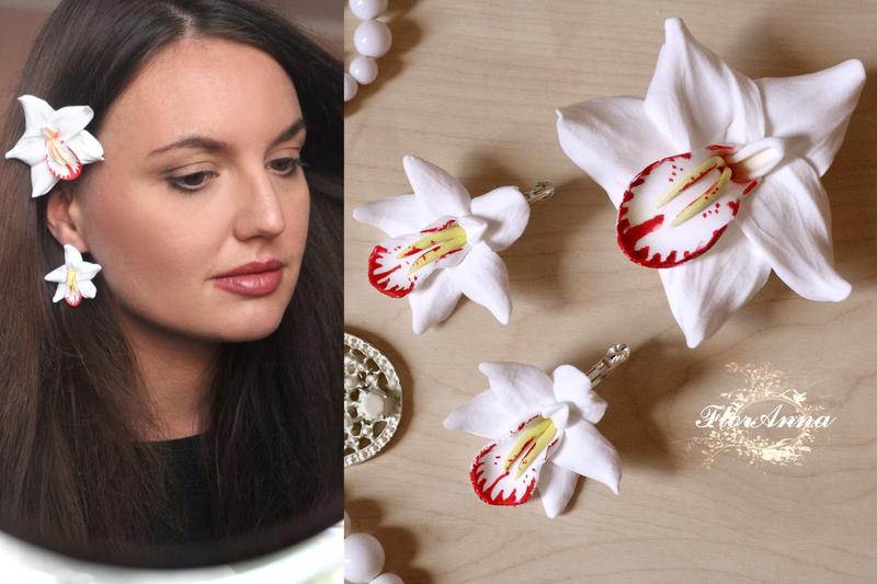Комплект украшений из полимерной глины "белые орхидеи с росписью"