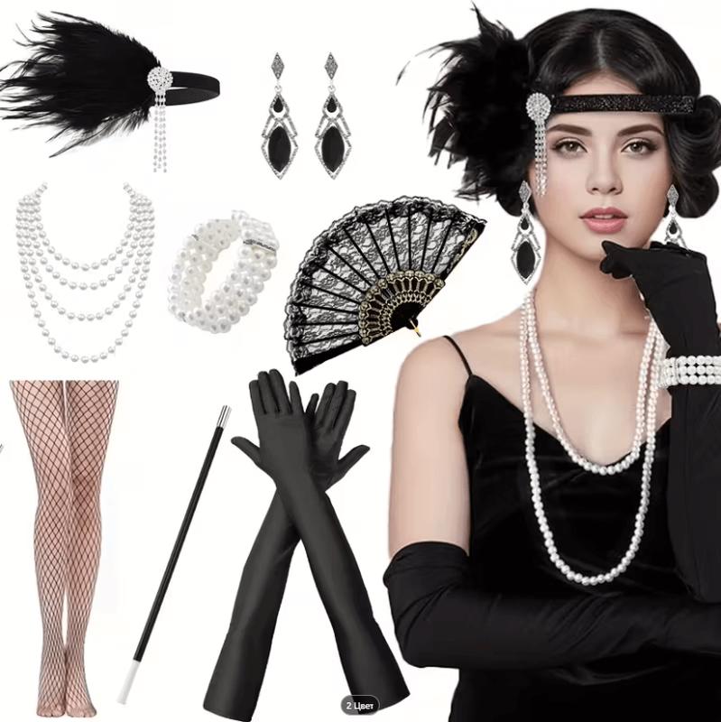 ## VIP Набор ретро (10 предм) Гэтсби,костюм 1920-е годы Код 081614 Карнавальный набор аксессуаров в гангстерском стиле — это продуманный до мелочей комплект, который мгновенно завершает образ и превращает вас в утончённую героиню ретро-эпохи. Всё, что нужно для создания безупречного лука, уже собрано в одном наборе. В комплект входят: 1. Эффектный головной убор на резинке, густо украшенной пайетками, с пышными реальными натуралистичными перьями и изысканной диадемой со сверкающими камнями типа «бриллианты», и подвесками - в центре — придаёт образу нотку роскоши и театральности – 1 предмет 2. Пара длинных чёрных перчаток, идеально подчёркивающих изящество рук – 2 предмета 3. Ажурные колготы в крупную сетку, создающие ауру загадочности, женственности и таинственной сексуальности – 1 предмет 4. Трёхрядный браслет из крупных жемчужин — символ классической элегантности – 1 предмет 5. Четырёхрядное жемчужное ожерелье, добавляющее блеск и винтажное очарование – 1 предмет 6. Мундштук длиной 32 см в стиле Голливуда 30-х годов — штрих, без которого не обходится ни один вечерний гламурный наряд – 1 предмет 7. Ажурный чёрный полупрозрачный гипюровый веер – 1 предмет 8. Серьги с камнями благородного чёрного цвета из металла типа СЕРЕБРО с мелким камешками типа «бриллики» с выразительным гангстерским ретро-дизайном, гармонично завершающие ансамбль – 2 предмета Итого 10 предметов (8 аксессуаров) На фото представлены все элементы набора с точными размерами. Такой комплект позволит без труда создать завершённый, уверенный и эффектный образ для костюмированной вечеринки, ретро-балла, новогоднего корпоратива или маскарада. Всё, что останется — выбрать подходящее платье, и вы готовы блистать в стиле настоящей леди из эпохи джаза и гангстерских легенд.