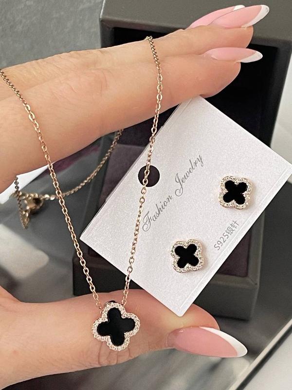 Набор медсталь, клевер клевер ванклиф черный под оникс, контур камушки, колье и пусеты гво...
