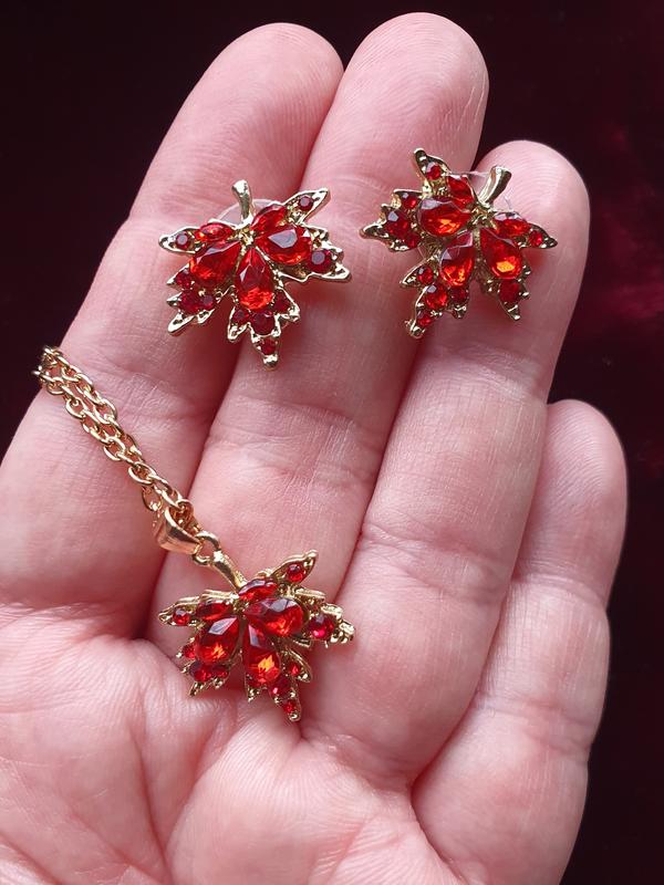 Изысканный комплект «кленовый лист» в золотом цвете с красно-коричневыми стеклянными кристаллами. Комплект состоит из пусет и подвески на цепочке. Общая длина цепочки 51 см. (46 см.+5 см. удлиняющая часть). Состояние нового. Замеры на фото. Все фотографии актуальны. Вы получаете товар указанный в объявлении и на фотографиях.