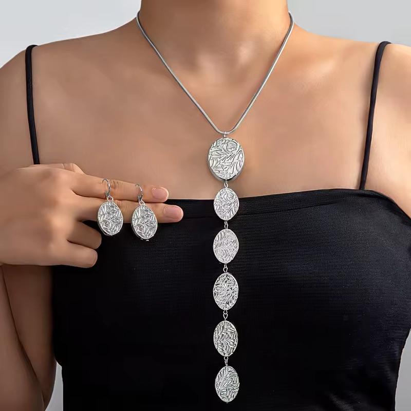 Акція! БЕЗКОШТОВНА ДОСТАВКА на замовлення біжутерії на суму від 1000 грн. (До відділення пошти або поштомат) Акція діє при оплаті на реквізити Довжина сережок - 5 см, ланцюжок - 45 см, плюс 5 см, передня частина з підвісками - 21 - 22 см У комплект входить довга підвіска‑медальйон на змійці‑ланцюжку та масивний браслет із декількох з’єднаних овальних ланок з однаковим об’ємним візерунком, які створюють ефект литого металу преміум‑класу. Не важкі. Такі прикраси добре поєднуються як з лляними сукнями й сорочками у стилі бохо, так і з лаконічними однотонними образами, де сріблясті «монети» стають головним акцентом