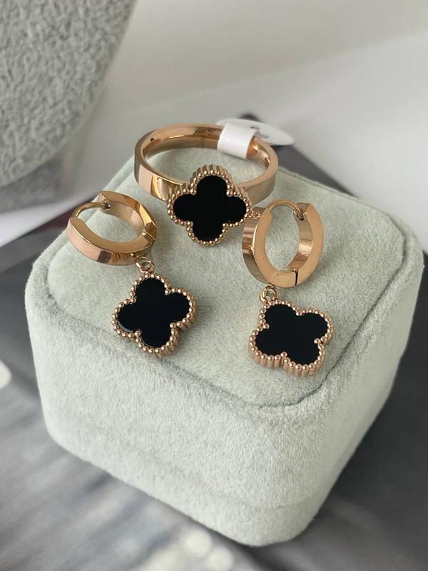 Набор медсталь, клевер клевер ванклиф черный под оникс, серьги и кольцо