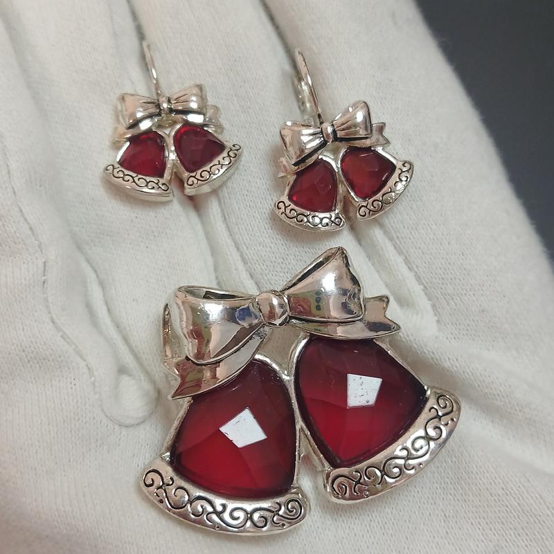 Волшебный набор брошка&кулон и серьги колокольчики с красными 🍓кристаллами серебристого цвета фурнитура!🌲🎁🎉Размер брошки 4,0*3,0см. Размер сережек 2,5см*1,8см. Общее состояние набора идеально! Цена набора 750грн. Украшения привезены из США.