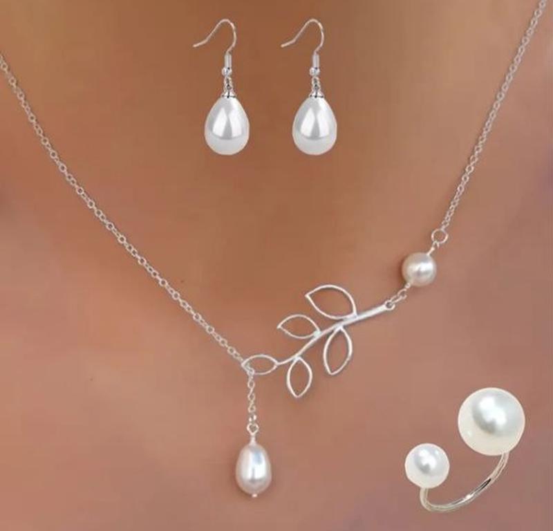 Красивый женский набор украшений: подвеска, серьги и кольца, серебристые украшения с жемчу...