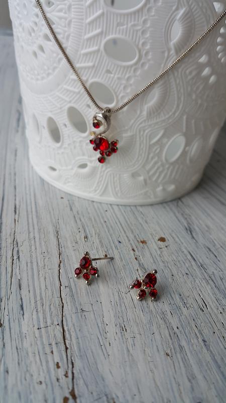 Милый нежный наборчик, но есть ньюанс- на подвеске потерян один камешек. Гибкая цепочка. Подвеска ложится примерно в ямку на шее. Серьги -гвоздики