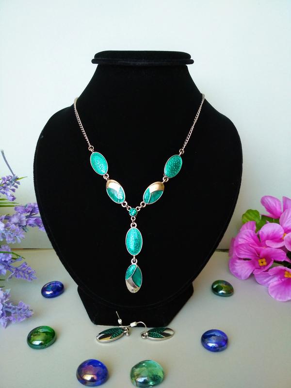 Нежный набор (колье и серёжки) от Avon. Украшение имеет застежку карабин и цепочку для регулировки ширины. Длина украшения: 48,5 см. Длина серёжек: 3 см.