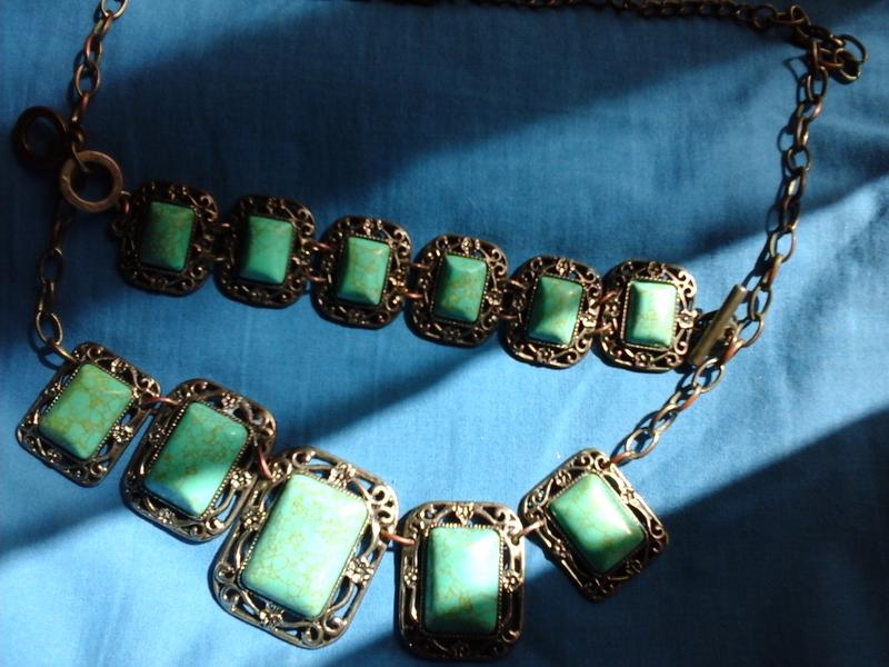 Набор из колье и браслета. Мельхиор + бирюза. Колье 55-60 см. Брасле16-19 см.