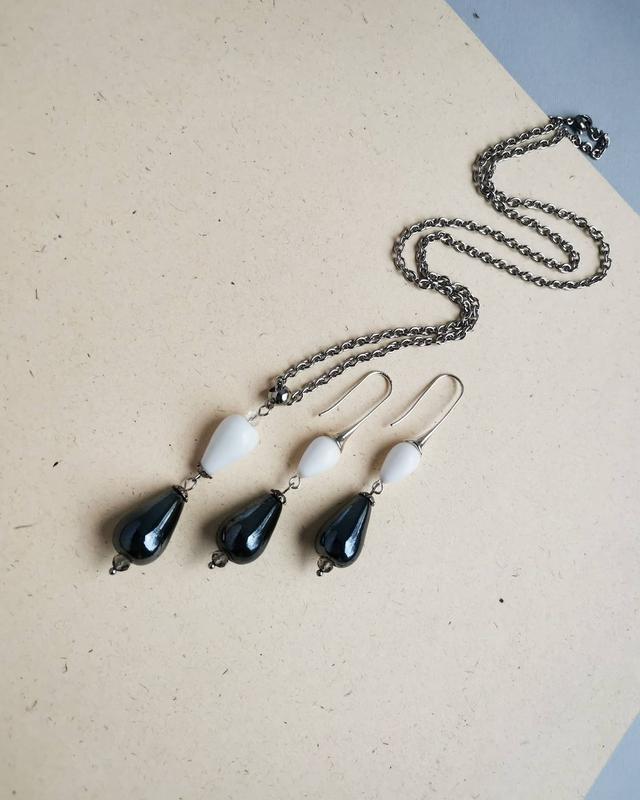 Комплект из стеклянных бусин ручной работы Кулон с медицинской фурнитуры, серьги бижутерный сплав. Длинна сережек 8см, кулон 50см