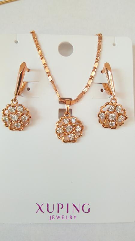 Серьги "Цветочек". Материал: мед.золото. Цвет покрытия: позолота. Вставка: цирконы. Размер: 2,8 см. Застёжка: английская. Производитель: Xuping. Кулон "Цветочек". Материал: мед.золото. Цвет покрытия: позолота. Вставка: цирконы. Размер: 1,4 см. Производитель: Xuping