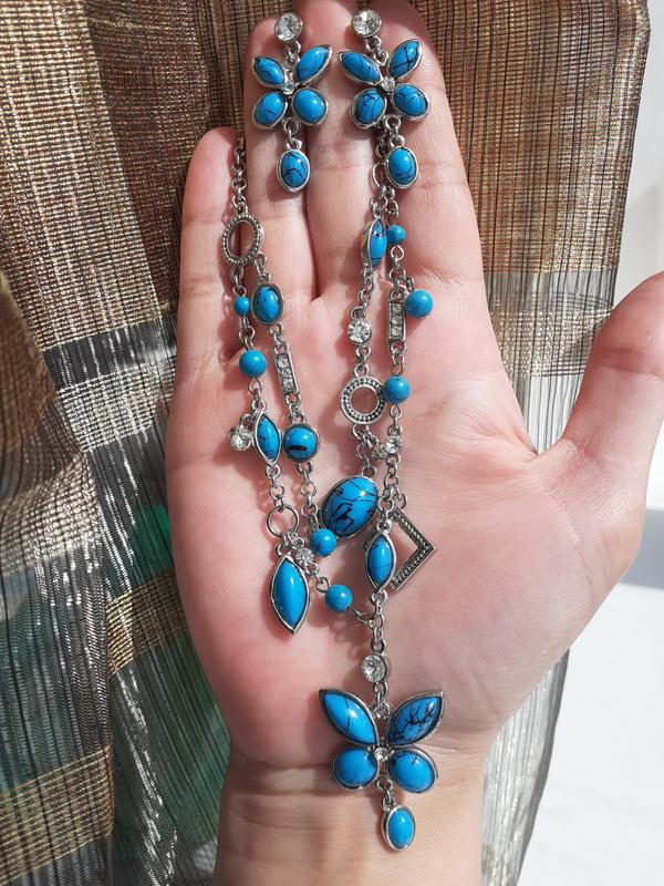 Красивый набор ожерелье и серьги с кристаллами и имитацией бирюзы. Длина серёжек 4.5см,в колье размер регулируется.