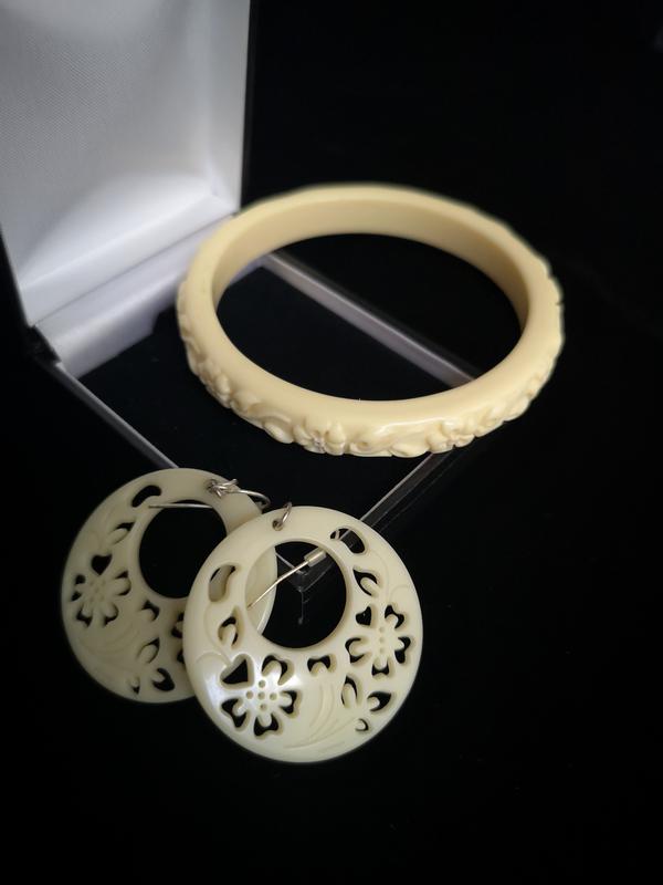 🌾Склався ось такий чудовий вінтажний комплект з целулоїда: браслет та сережки. Красиве різьблення дуже нагадує слонову кістку. Целулоїд - винайшов американець в 1972 році Джон Уеслі Хайят. Прикраси з целулоїду часто мають високу колекційну цінність, перші прикраси з целулоїду з'явилися в 1875 році, це справжній антик, і відшукати їх зараз важко. З целулоїду вирізали камеї, його використовували для створення намистин, з нього робили надзвичайні браслети. Багато з них були створені в Японії. Саме японські майстри в 20-их - 50-тих роках подарували безліч справжніх шедеврів з целулоїду. Зараз прикрас з целулоїду не так багато, як хотілося б. Вони розходяться по приватних колекціях, і цінуються досить високо. Можна сказати, що вироби з вантажного пластика ростуть в ціні з кожним роком більше, ніж вироби з дорогоцінних металів. Чудовий вінтажний стан, без нюансів.