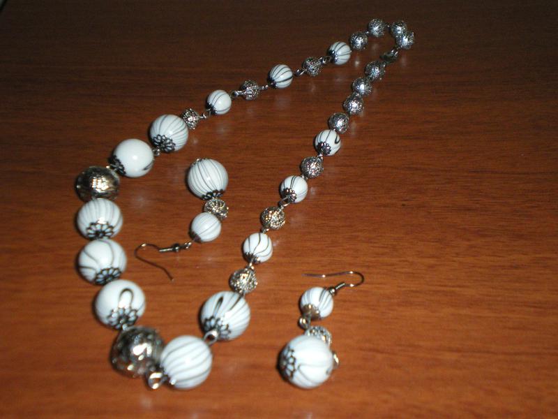 В наборе бусы и серьги из акриловых бусин и фурнитуры под серебро, длина колье -50-55 см. Красивые серые бусины с черным паутинчатым рисунком. Дополнительные фото по желанию.