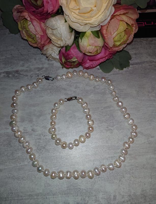 Набор колье и браслет из речного натурального жемчуга, жемчуг крупный диаметр ок. 7-8мм, смотрится красиво Размер бус ок. 48см Браслет 17 размер