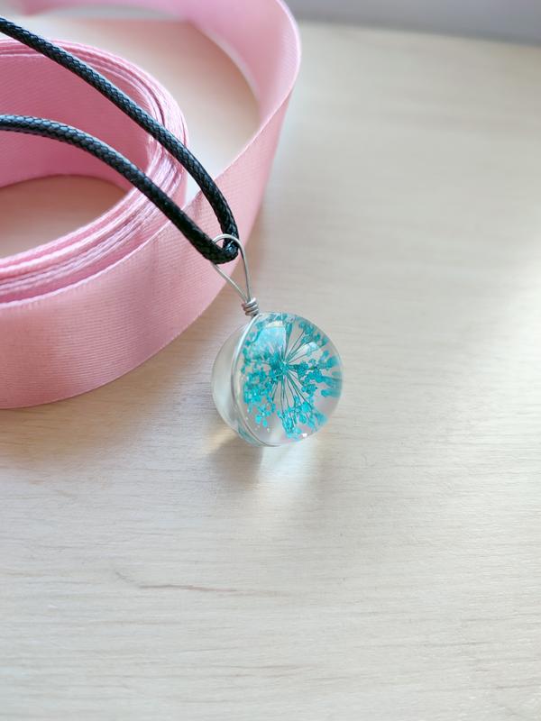 Кулон шар з квiткою яглицi на шнурцi . колiр блакитний