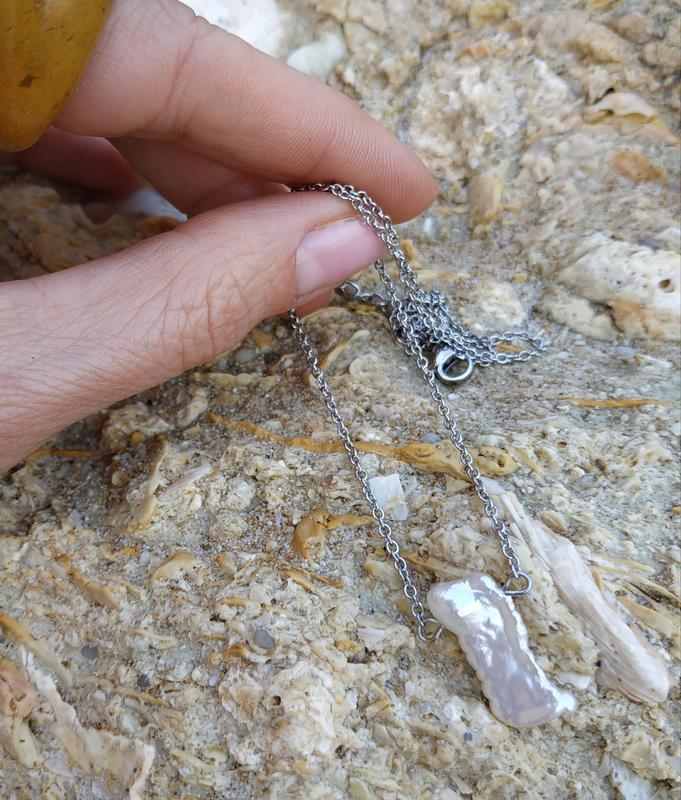 Вишукане кольє - чокер з натуральними білими перлами Кеші виконане на фурнітурі з ювелірної нержавіючої сталі. А це означає, що метал не потемніє, не викличе алергію, не іржавіє і дозволить прикрасі довгі роки тішити власницю. Довжина по шиї 45-49 см, розмір перлини 8х17 мм. є сережки для комплекту. Перли Кеші перекладаються з японської як «зернятко, мак». Ці красиві перли, що мають неправильну форму, зовсім не мають ядра. Він відомий своїм особливим перламутровим переливчастим блиском і дивовижними химерними формами. З′являється Кеші в тому випадку, якщо при культивуванні молюск відкидає впроваджене в нього ядріво перлів, але виробництво перламутру продовжується.