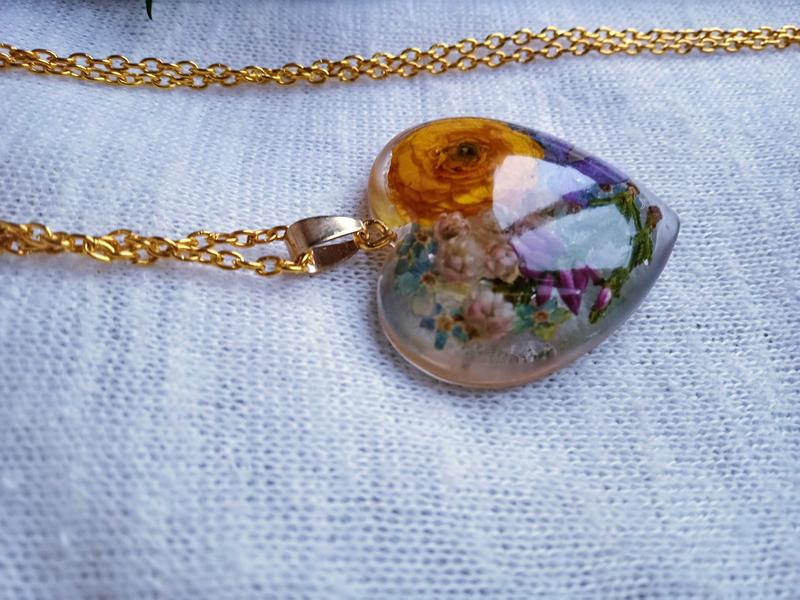 Кулончик з сухоцвітом вересу, незабудок, озотамнуса та лютика в смолі у формі сердечка. Розмір сердечка 40х30 мм Довжина ланцюжка 70 см