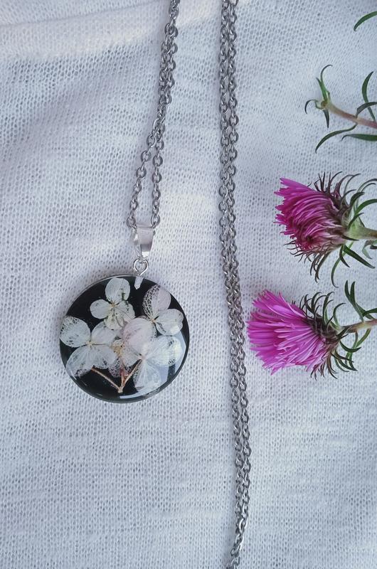 Кулон з сухоцвітом гортензії в смолі. Діаметр 25 мм Ланцюжок 70 см