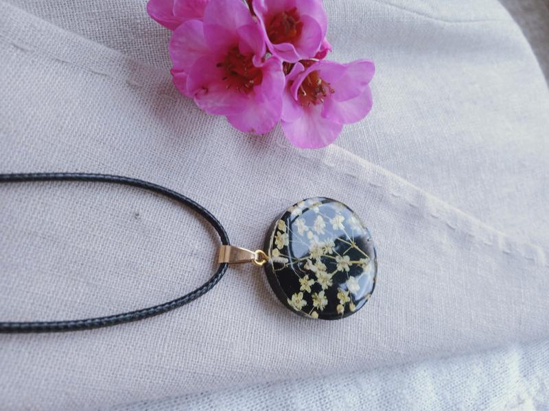 Кулон з сухоцвітом бузини в ювелірній в смолі. Діаметр 25 мм Чорний вощений шнур 50 +5 см