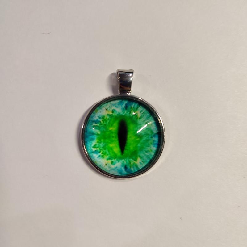 Кулон размером 2,5 см в диаметре. Стеклянный кабашон и цинковый сплав. В набор идет черный шнурок. Есть еще другие варианты с изображением глаза.