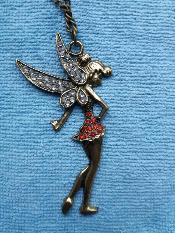 Украшение-кулон из ювелирного сплава на длинной цепочке в виде феи. Длина цепочки в застегнутом виде 34 см. Высота кулона 7 см.