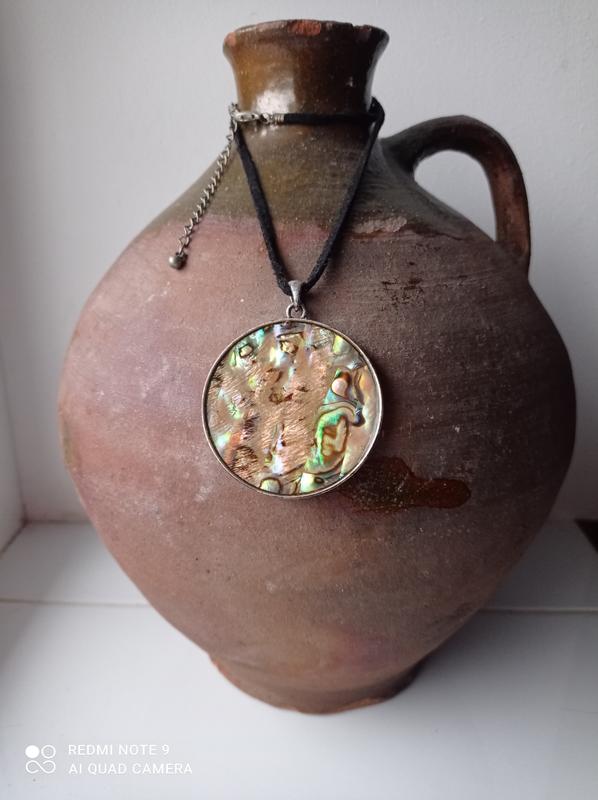 Кулон в стиле бохо. Диаметр 4,7 см. Металл и перламутр.