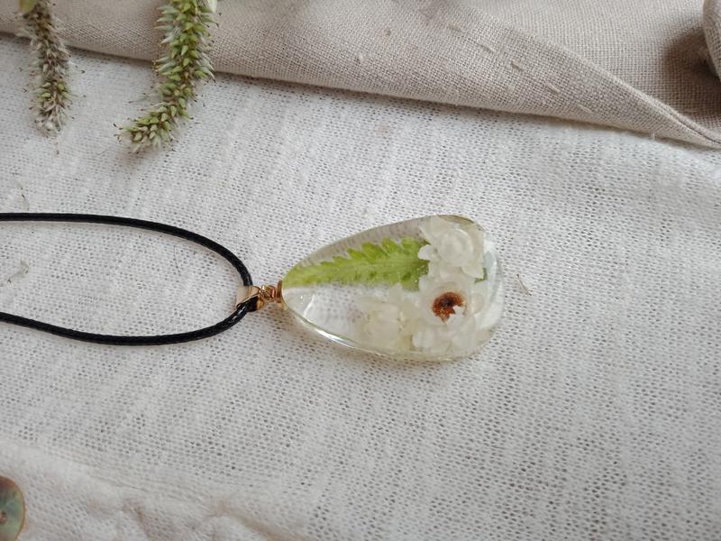 Кулон з квіткою амобіуму та папороттю в смолі. Вощений шнур 45+5 см