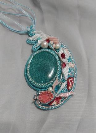 Кулон кои вышитый кулон из бисера, страз и бусин, украшения ручной работы, бисерные украшения Кулон Кои Вышитый кулон Кои Вышитый кулон с натуральным камнем агатом. Чешский и японский бисер. Чешские бусины, канитель, пайетки , страз. Застежка металл серебристого цвета. Обратная сторона кулона - натуральная кожа. Кулон на ленте. Длина ленты 43см. Дополнительные характеристики: Цвет : Голубой Камни / вставки : Агат Материал : Бисер Материал : Бусины Материал : Кабошон Материал : Металлическая фурнитура Материал : Фетр Вид изделия: Кулон Камни вставки: Агат Цвет и оттенок: Голубой Тематика : Рыбы Назначение: Для женщин