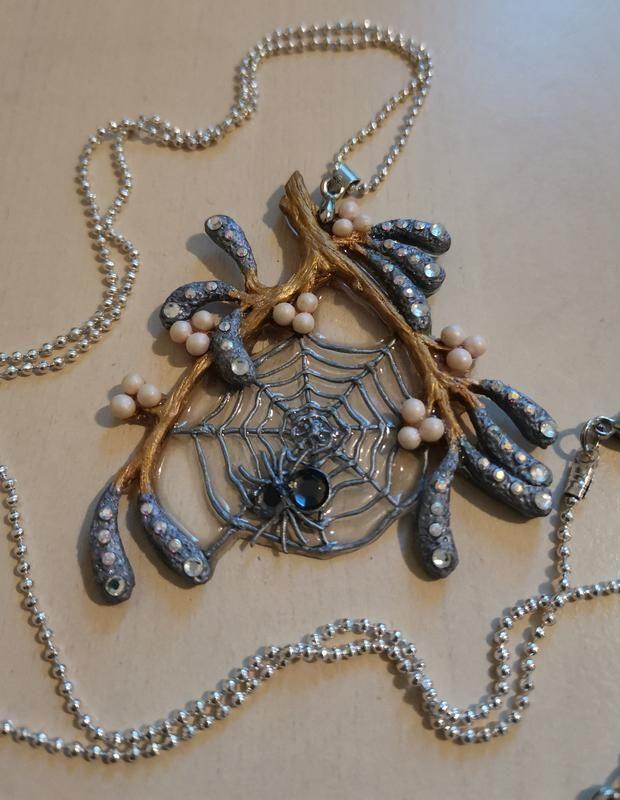 Кулон "Spider on a branch" Матеріали: полімерна глина, металева фурнітура, кристали Swarovski, стрази, епоксидна смола. Розміри : кулон - 5х5см, довжина ланцюжка - 60см, подовжується. Можливе виконання прикрас за вашим індивідуальним замовленням. Дополнительные характеристики: Материал : Бусины Материал : Металлическая фурнитура Материал : Полимерная глина Материал : Эпоксидная смола Вид изделия: Кулон Камни вставки: Кристаллы Swarovski Тематика : Бабочки/насекомые Тематика : Растения Назначение: Для женщин