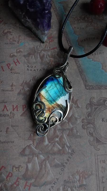 Кулон з лабрадоритом, створений в техніці Wire Wrap. Метал: нейзильбер, латунь. Розмір кулону: 6,5х2,5 см. Дополнительные характеристики: Вид изделия: Кулон Камни вставки: Лабрадор Цвет и оттенок: Голубой Цвет и оттенок: Желтый Цвет и оттенок: Синий