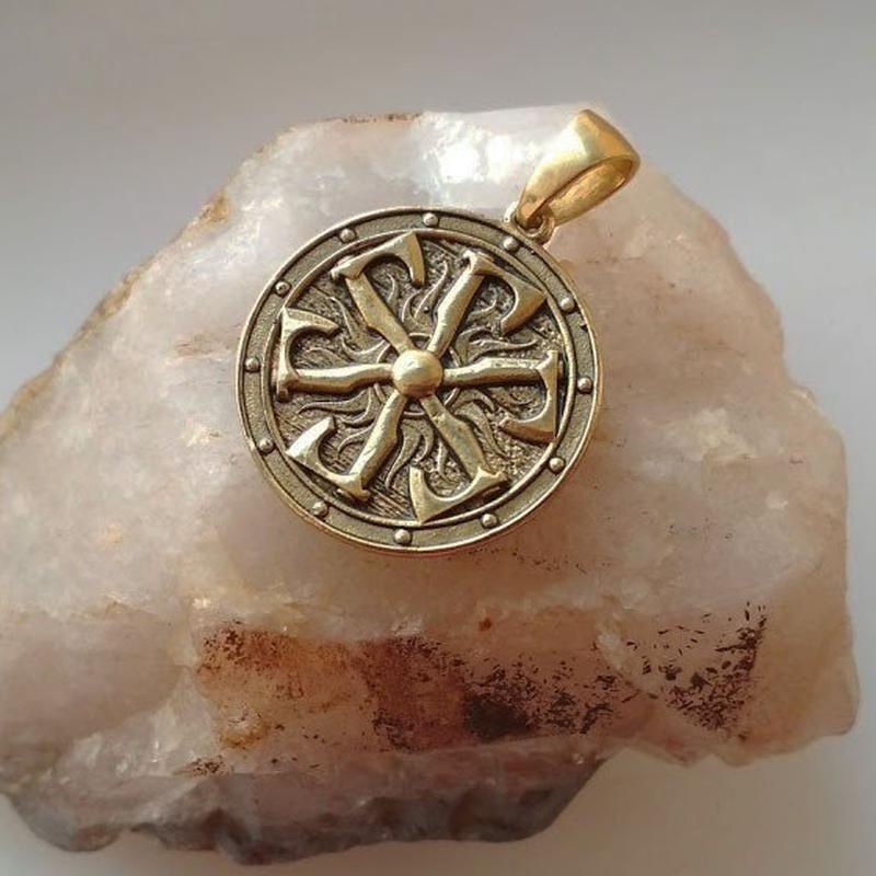 Коловрат («коло» - колесо, «врат» - ворот) – знак, означающий вечный природный круговорот, вращение колеса жизни. Представляет собой восемь однонаправленных лучей, образующих стилизованное колесо. Славяне всегда почитали Солнце, как источник жизни. Возможно, именно поэтому солнечная тематика присутствует во многих славянских обережных символах, призванных помогать живущим. Кроме того, активная энергия Солнца позволяла усилить действие оберега. Как солярный символ, «Коловрат» связывался с годичным солнечным циклом и непрерывным движением этого небесного светила. Также в этом знаке зашифрованы четыре элемента (воздух, вода, земля, огонь) и четыре стороны света, а, согласно некоторым источникам, и четыре времени года. Таким образом, человек, получивший оберег «Коловрат» как бы становится частью великого круговорота природы и гармонизируется с ней. «Коловрат» с лучами, направленными по ходу Солнца (посолонь), связан с миром Яви. Он принесет своему обладателю защиту и покровительство Высших Сил, но лишь в том случае, если помыслы человека чисты и направлены на добро. Традиционно правосторонний «Коловрат» считается мужским оберегом. Оберег с лучами, направленными против хода Солнца (противосолонь), больше связан с миром Нави, а, значит, способствует раскрытию природных склонностей к ясновидению, пророчеству и другим магическим практикам. В любом случае, левосторонний «Коловрат» помогает развить интуицию и проницательность, и потому считается женским вариантом этого оберега. Однако, как бы ни были направлены лучи «Коловрата», этот оберег даст вам мощную защиту от внешних негативных магических воздействий, наполнит силой, поможет укрепить здоровье и дух, наделит оптимистическим настроем и поможет одержать победу над явными и тайными врагами. Обладателю «Коловрата» непременно будет сопутствовать удача в делах. Но помните: мудрое Солнце никогда не направит свою животворящую энергию на зло и корысть… У нас собственное производство, возможно изготовление из серебра или золота с любыми изменениям и дополнениями в дизайне. Изделие выполнено из итальянской ювелирной бронзы, оно не потемнеет, не облезет т.к. полностью состоит из одного сплава. Украшение можно легко подполировать, обычной влажной салфеткой, и оно будет выглядеть как новое, даже через многие годы! .