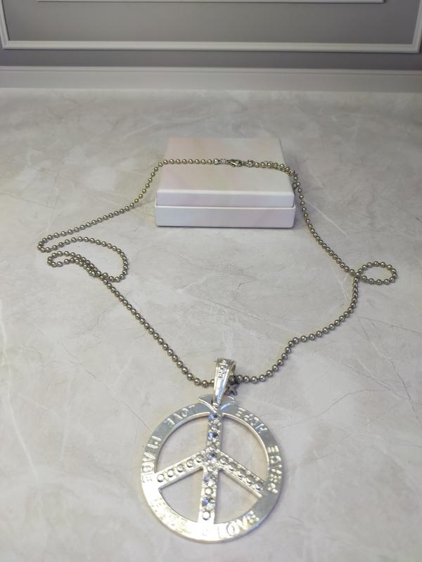 Большой кулон металлический. Серебристого цвета. Длина цепочки -80+5см. Кулон -5,6см. Надписи- peace, hope, love (мир, надежда, любовь)