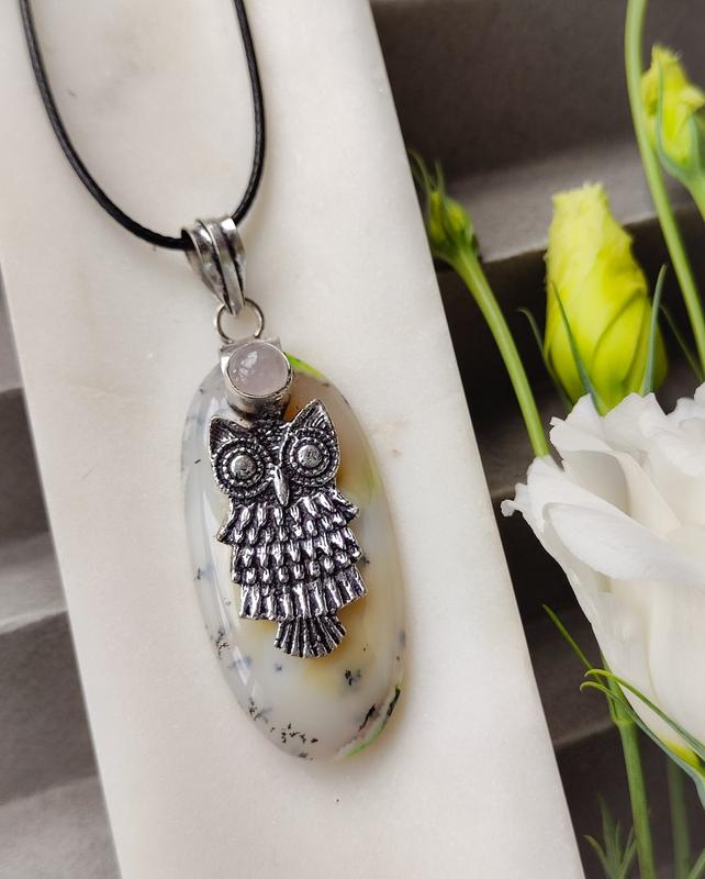 Підвісок "сова" дендроопал овал та рожевий кварц. дендритовий опал в сріблі. дендро-опал о...