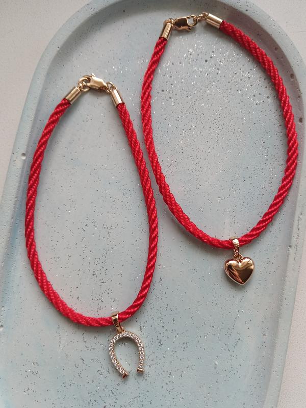 красная нить предохраняет на руку с кулоном сердечко или подкованая