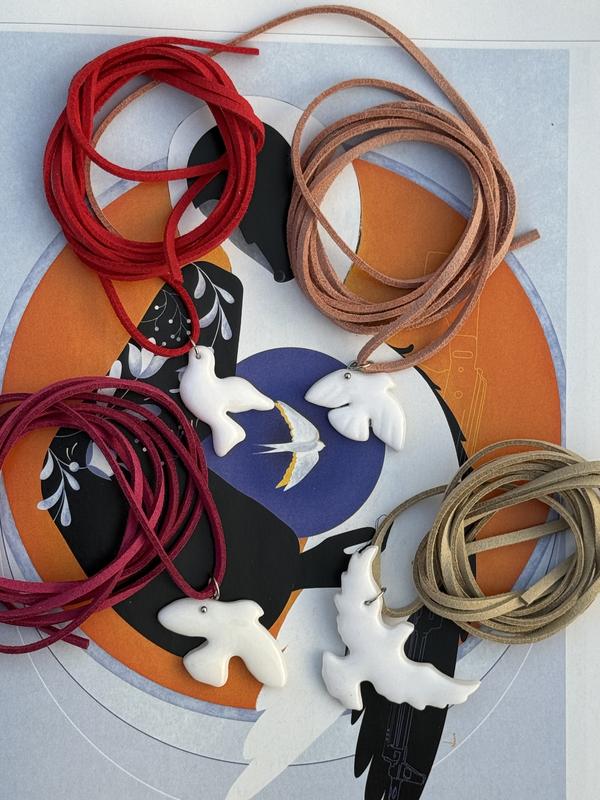 Птахи з полімерної глини на замшевому мотузочку (колір на вибір). 200 грн.