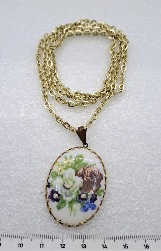 Очень красивый кулон в стиле Финифть, Цепочка и кулон - легкий металл, вставка фарфор, обратите внимание не хватает одного зубчика для зажима фарфора. Все вопросы задавайте до покупки.