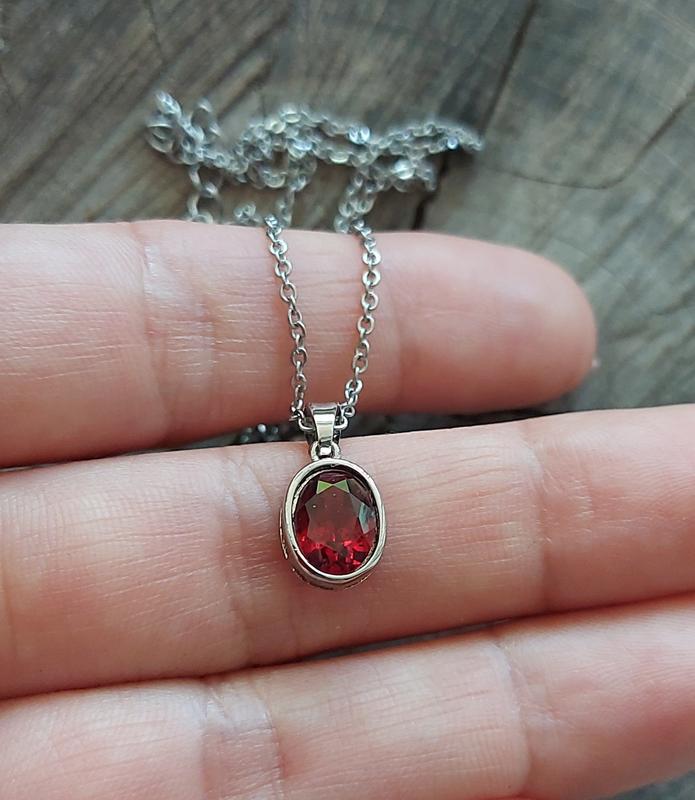 Кулон с натуральным гранатом. Размер камня: 9х7 мм. Длина цепочки: 40 см. Металл: хирургическая сталь с посеребрением.