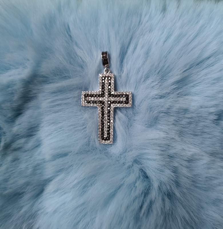 Новый серебряный крест, украшенный черными и прозрачными фианитами.