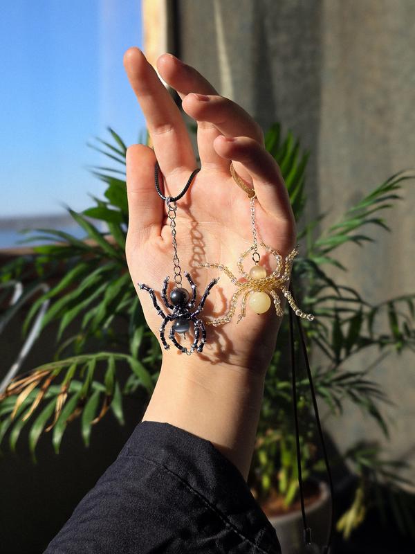 Кулон паук 🕷️ Светлый - оникс, кошачий глаз, горный хрусталь, бисер 💎 Тёмный - гематит, кошачий глаз, бисер 💎 Размер бусин - 2, 3, 8 и 10 мм Шнурки идут в комплекте Цена - 190 грн/шт. В эзотерике Паук - мощный символ созидания, судьбы, мудрости и терпения, олицетворяющий способность плести узоры собственной жизни. Символизирует связь между прошлым и будущим, контроль и творческую силу. Паук плетет паутину, как человек - свою судьбу, напоминая, что мы сами создаем свою реальность мыслями, чувствами и поступками. Тело паука состоит из двух частей, напоминая форму восьмерки, а в дуэте с восемью лапами получаем связь паука со всем многообразным мистицизмом цифры 8, являющейся символом бесконечности. 8 представляет собой колесо жизни, переходящей от одного круга к другому, а паук учит не только совершать это бесконечное движение, но и удерживать своё сознание в центральной точке, расположенной между двумя кругами. Паук считается хранителем древних знаний, символизирует связь с созидательной женской силой, дарит независимость и внутреннюю защиту. Это знак трудолюбия (способен плести роскошные сети), что делает его символом достатка и гармонизации мира. Увидеть паука в доме - к удаче, деньгам, прибыли и хорошим новостям. Считается, что паук, сидящий в доме на паутине, собирает весь негатив, очищая пространство. Если паук упал на вас - это к невероятной удаче или неожиданным деньгам. А вот убить паука - плохая примета, это сулит убытки, болезни и неприятности.